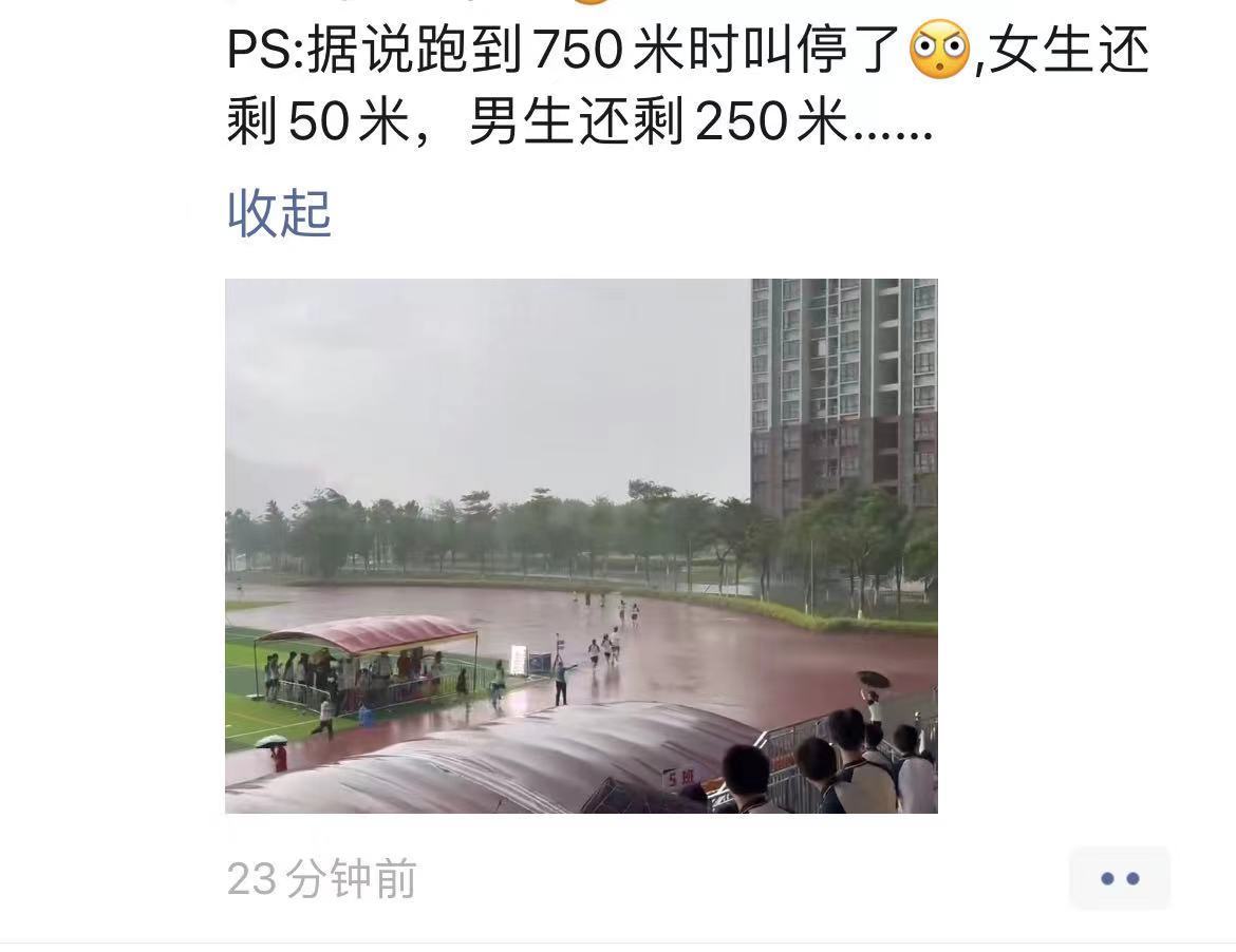 本日上昼,广州异邦语学校学生正进行第三项的中长跑神志熟识,当本组16名考生准备起跑时,雨势不大,考点空洞研判可不竭熟识,发令起跑开赴一圈后,降雨及风势瞬息增大,评判员立即叫停调回本组考生,并转动至安全场地,提供毛巾、热水、午餐、暖气及更衣室等保险设施。