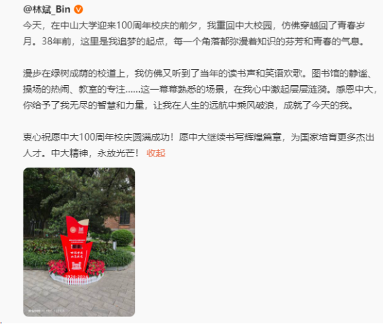 “散步在绿树成荫的校说念上,我仿佛又听到了当年的念书声和笑语欢歌。藏书楼的静谧、操场的烦躁、教室的专注……这一幕幕熟练的场景,在我心中激起层层激荡。感德中大,你赐与了我无限的聪惠和力量,让我在东说念主生的远航中乘风破浪,建树了今天的我。” 林斌说说念。